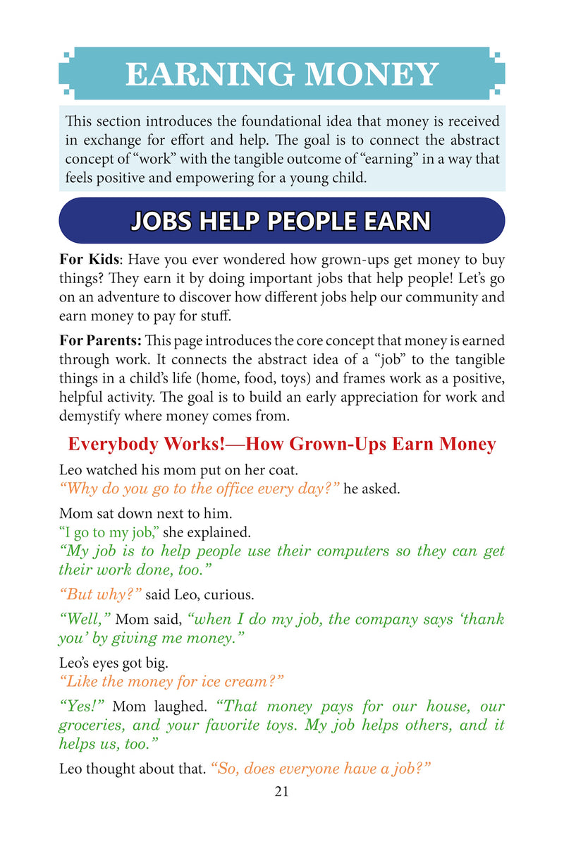 - Lessons on lemonade stands, sharing work, and the difference between gifts and earnings.