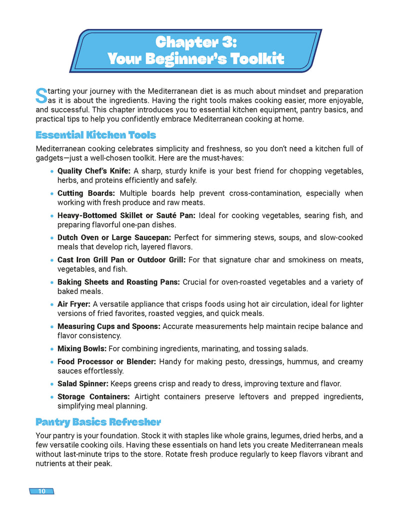 Starting your journey with the Mediterranean diet is as much about mindset and preparation as it is about the ingredients. Having the right tools makes cooking easier, more enjoyable, and successful. This chapter introduces you to essential kitchen equipment, pantry basics, and practical tips to help you confidently embrace Mediterranean cooking at home.