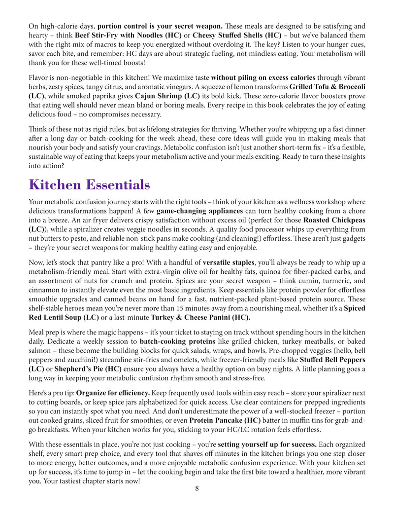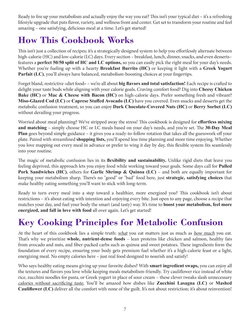 Forget bland, restrictive "diet food"—we’re all about big flavors and total satisfaction! Each recipe is crafted to delight your taste buds while aligning with your calorie goals. Craving comfort food? Dig into Cheesy Chicken Bake (HC) or Mac & Cheese with Bacon (HC) on high-calorie days. Prefer something fresh and vibrant? Miso-Glazed Cod (LC) or Caprese Stuffed Avocado (LC) have you covered. Even snacks and desserts get the metabolic confusion treatment, so you can enjoy Dark Chocolate-Covered Nuts (HC) or Berry Sorbet (LC) without derailing your progress.
